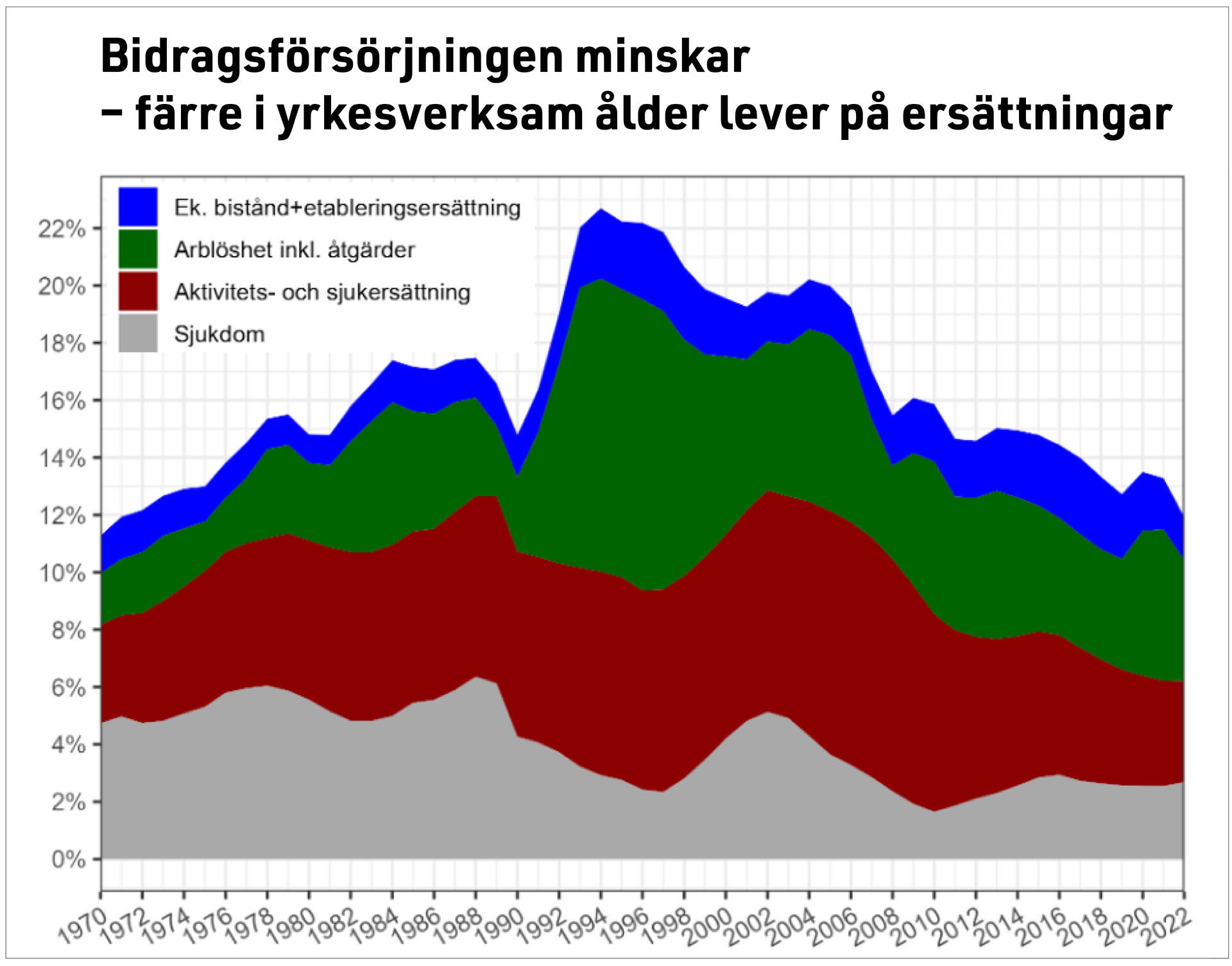 Källa: Ekonomifakta.se för 1970-1989, SCB för perioden 1990 - 2022. Det finns ett tidsseriebrott 1900 som främst innebär att andelen sjukskrivna sjönk med cirka en procentenhet. Diagram: Christian Lindell