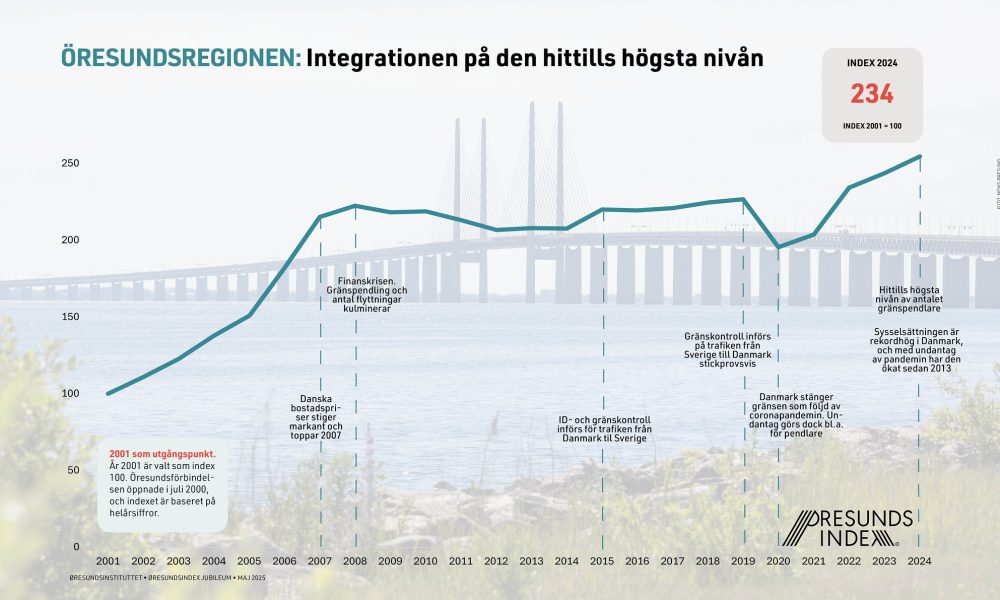 Integrationen över Öresund har sedan pandemin åter ökat och är nu på nya rekordnivåer. Det visar jubileumsutgåvan av Øresundsindex, som mäter integrationen över sundet från 2001...