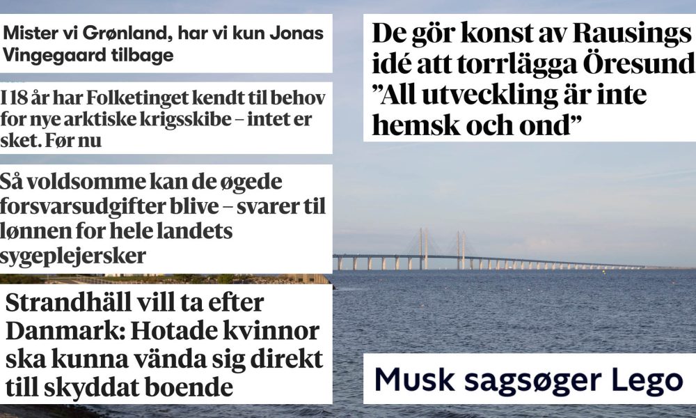 X stämmer Lego och Ørsted. Känd dansk gallerist hjälper Lundakonstnär. Svensk politiker vill ta efter Danmark för att hjälpa hotade kvinnor. Ökade danska försvarsutgifter kan motsvara...