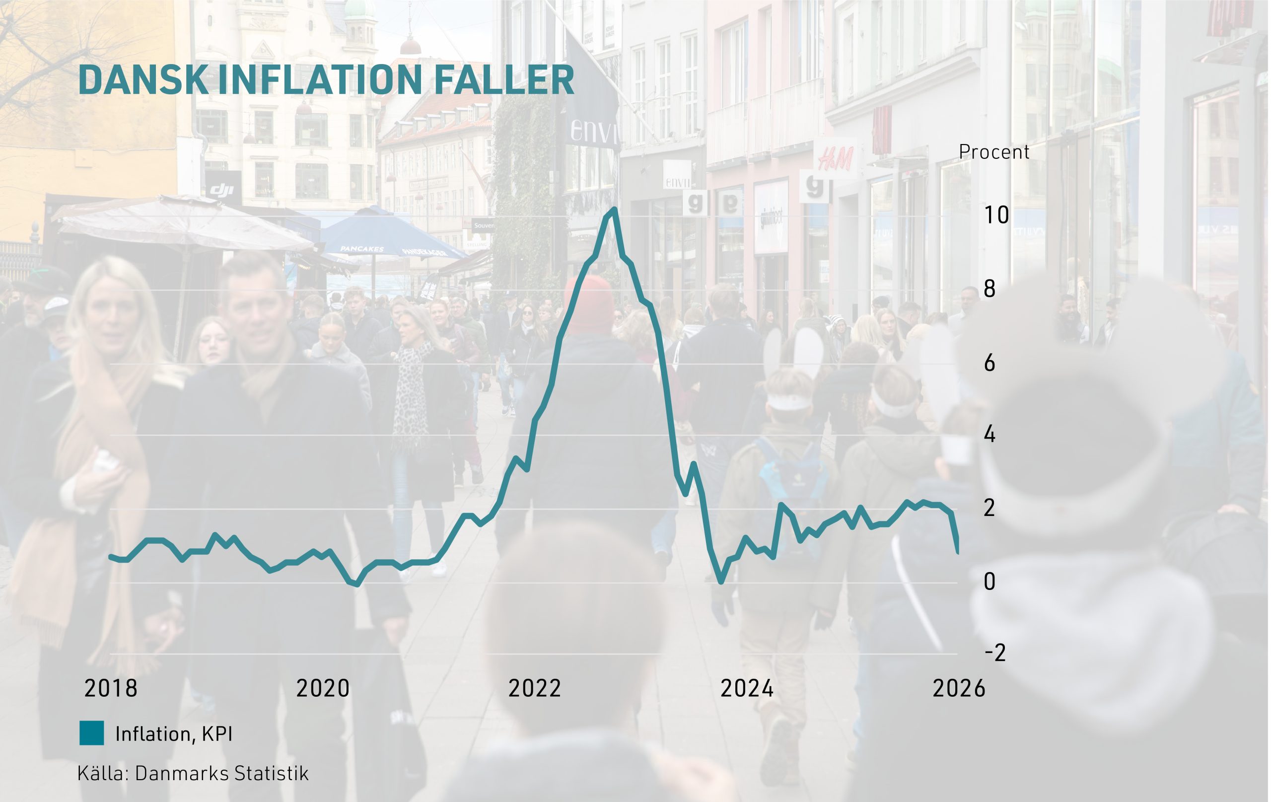 Sedan juni förra året har den danska inflationen legat stabilt kring två procent. Men i januari sjönk inflationen till 0,8 procent jämfört med samma månad i fjor, enligt nya siffror från Danmarks Statistik. Det kan jämföras med december då inflationen låg på 1,9 procent, mätt i årstakt.