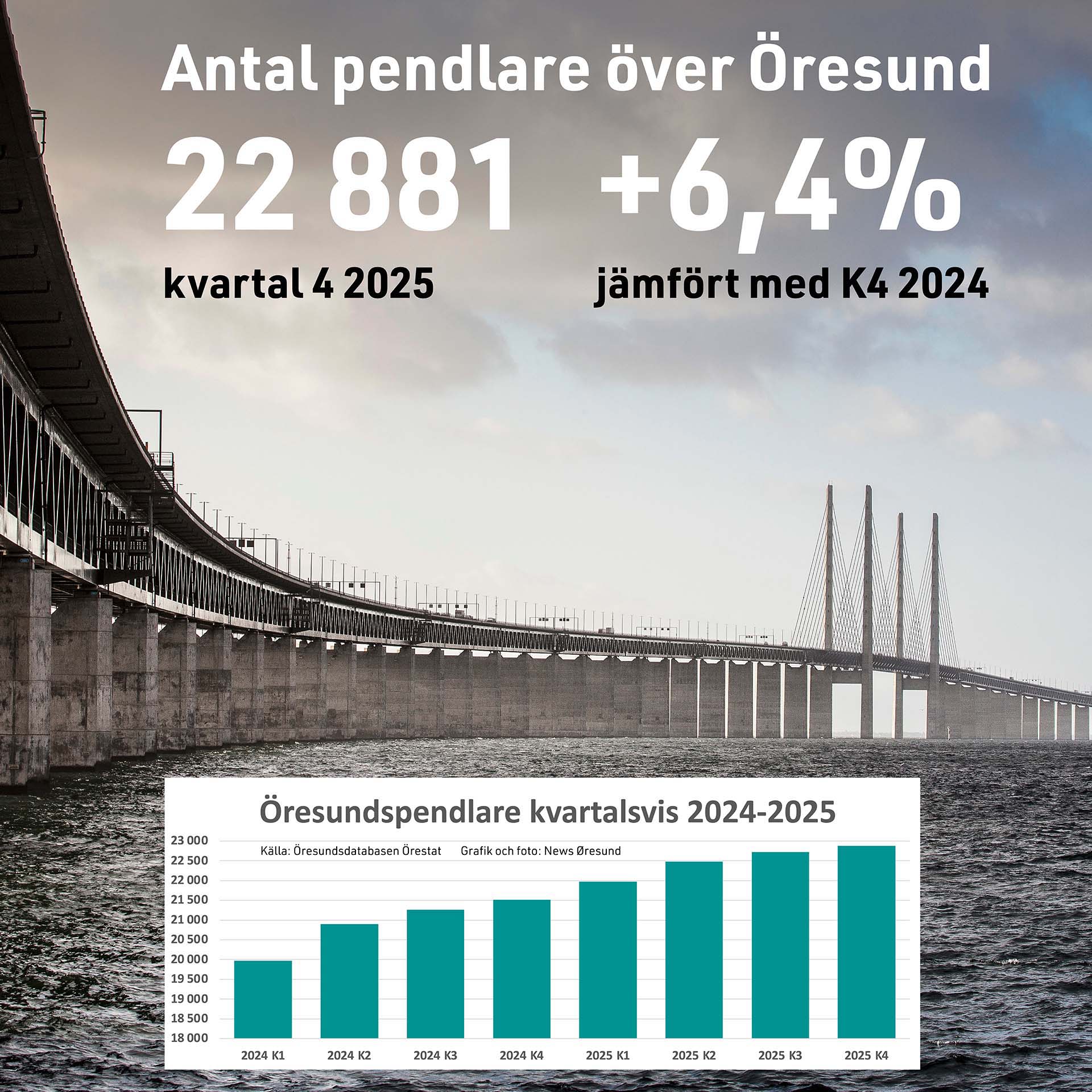 Under fjärde kvartalet 2025 pendlade 22 881 personer över Öresund. Det är en ny rekordnivå och en ökning med 6,4 procent jämfört med samma kvartal året innan. Men det är bara pendlingen från Sverige till Östdanmark som ökar och då med 7,0 procent till 22 034 pendlare. Från Danmark till Skåne minskade antalet pendlare med 8,3 procent till 847 personer. Det visar ny statistik från Öresundsdatabasen Örestat.