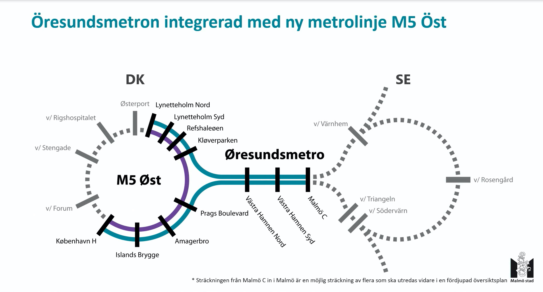 Skiss över möjlig sträckning och stationer för en Öresundsmetro i Malmö och Köpenhamn. Bild: Malmö stad