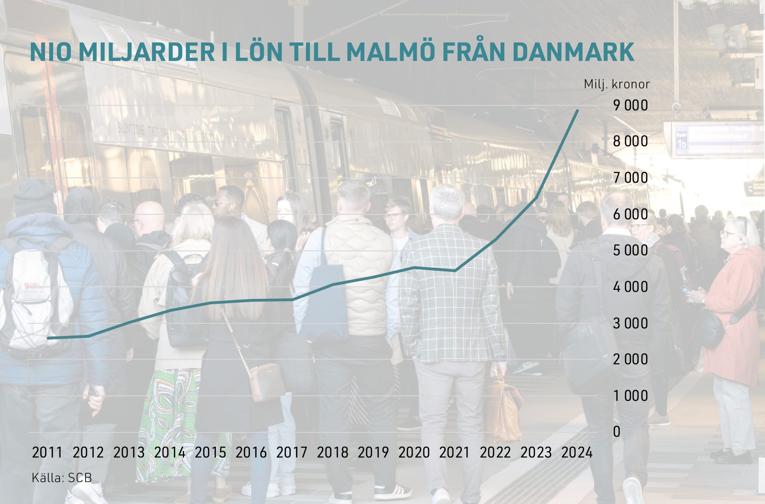 Knappt nio miljarder kronor i löneinkomster. Så mycket tjänade Malmöborna från Danmark under 2024. Det är en fördubbling sedan 2021...