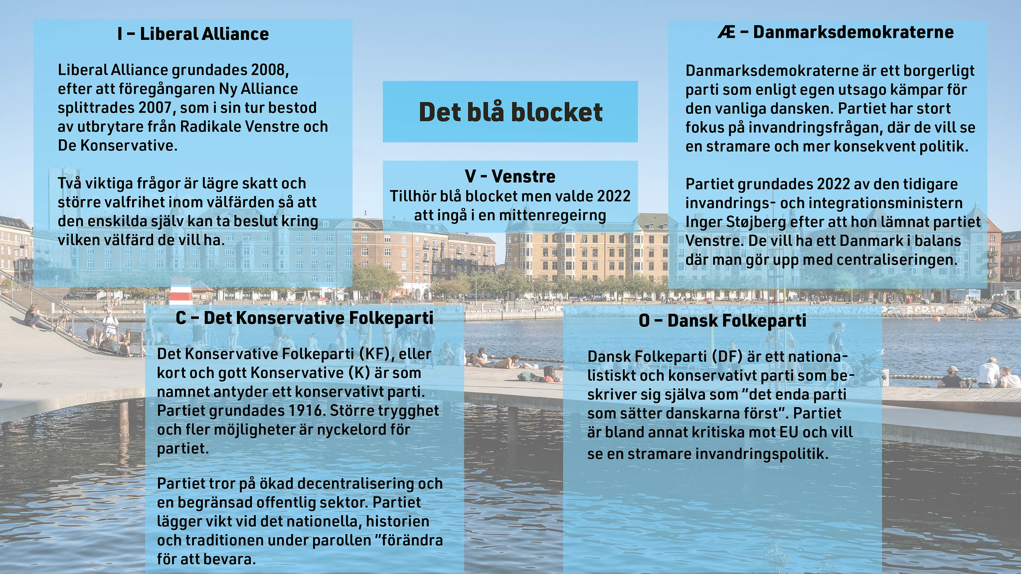 Till det blå blocket brukar, förutom Venstre, Liberal Alliance, De Konservative, Danmarksdemokraterne och Dansk Folkeparti räknas in.