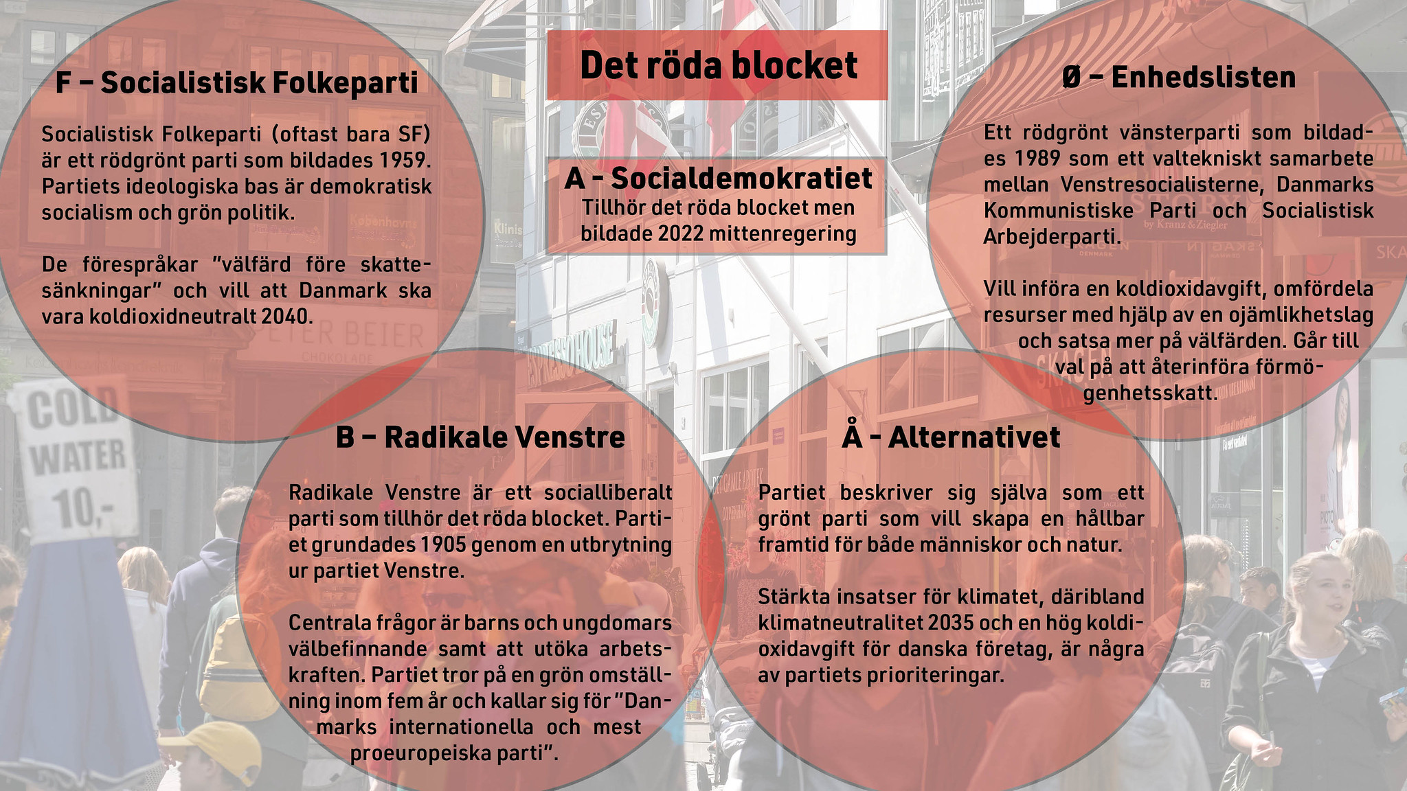 Till det röda blocket brukar, förutom Socialdemokratiet, SF, Radikale Venstre, Enhedslisten och Alternativet räknas in.