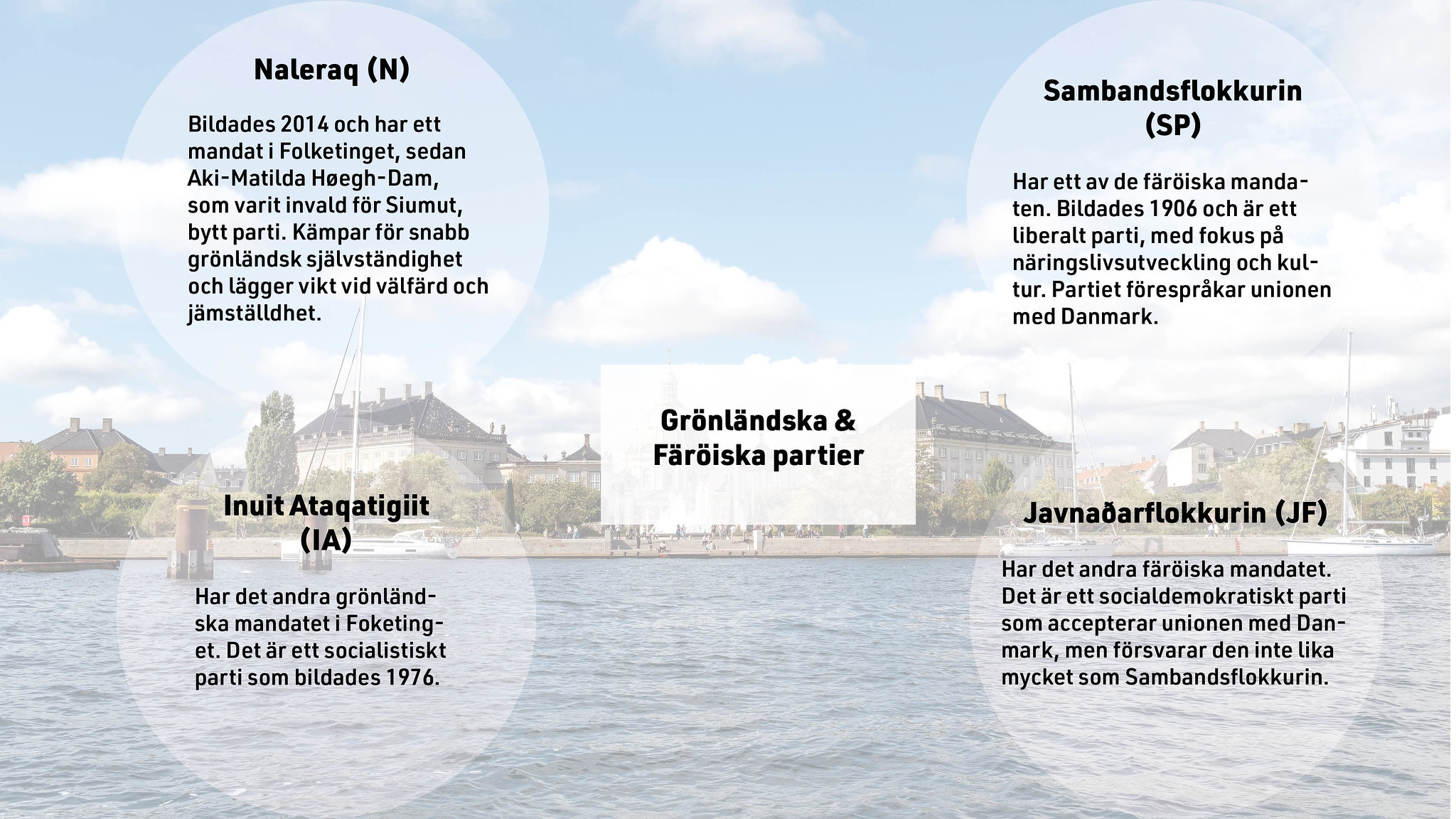 De två autonoma områdena Grönland och Färöarna ingår i konungariket Danmark, det så kallade Rigsfælleskabet. Fyra mandat i Folketinget öronmärks till två partier från respektive område och brukar kallas för de nordatlantiska mandaten.
