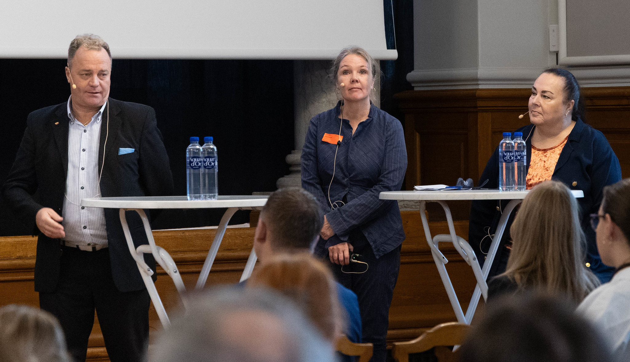 Jonas Åberg, projektledare i Halmstad kommun, Eli Skaug Syvertsen, Eures-rådgivare för Nav Agder och Dorthe Thybo Kudsk, internationell rådgivare och projektledare för Erasmus+ vid Aalborgs Techcollege i panelsamtal om sina erfarenheter med samarbete över landsgränser för yrkestuderande. Foto: Christina Solhøj Hansen/News Øresund