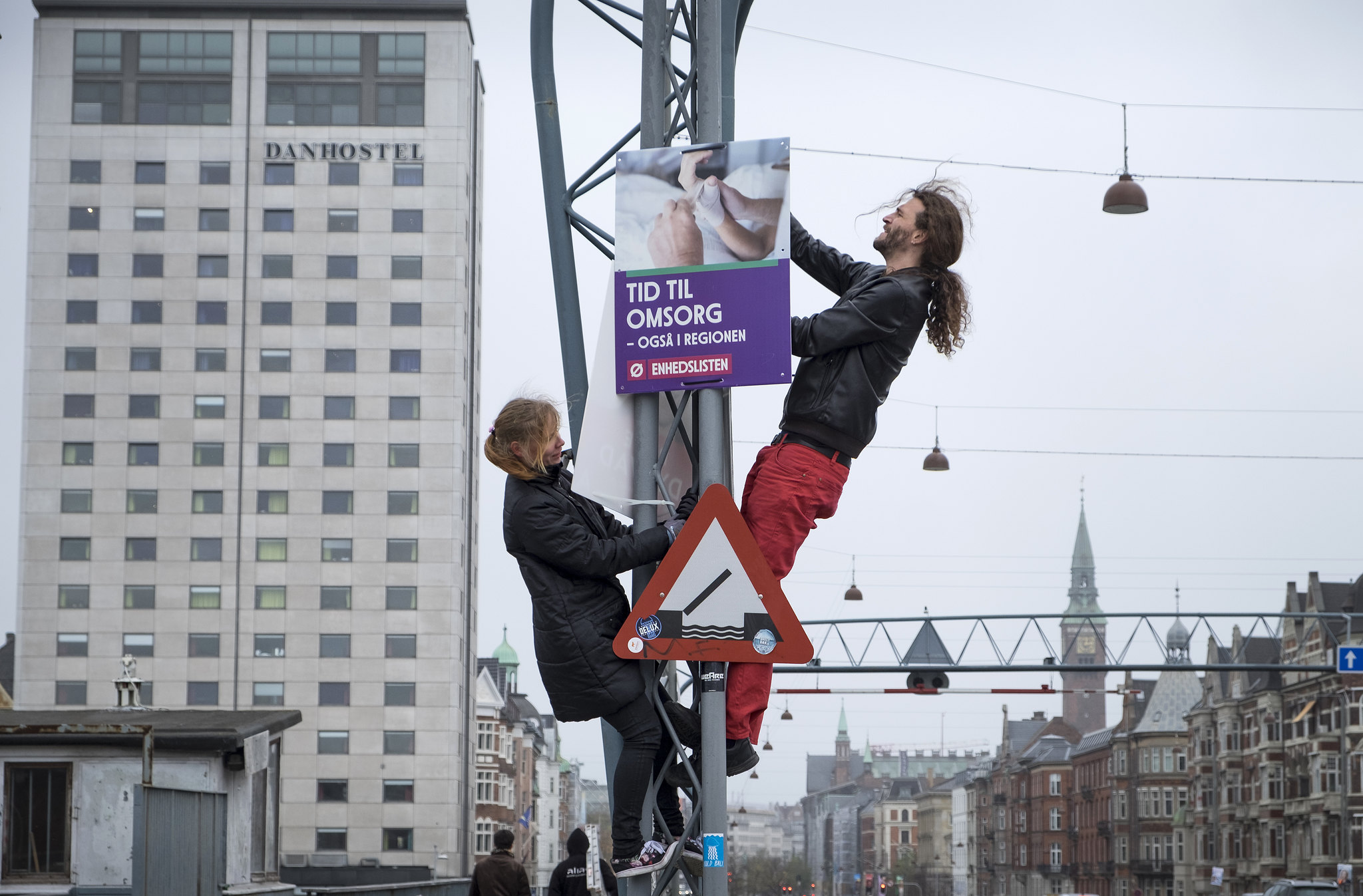 Lördagen den 25 oktober – den fjärde lördagen innan valet – får det hängas upp valaffischer i Danmark. Bilden är från valet 2017. Foto: Sofie Paisley/News Øresund