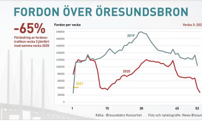 65 procent färre fordon körde över Öresundsbron under vecka 3 i år jämfört med samma vecka i fjor rapporterar Øresundsbro Konsortiet. Totalt passerade 42 091 fordon...