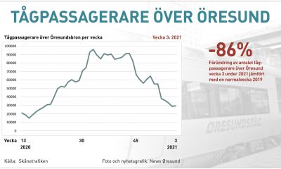 Danska och svenska gränsstängningar i kombination med utökat hemarbete bidrog till att antalet passagerare med Öresundstågen mellan Danmark och Sverige minskade med 86 procent under vecka...