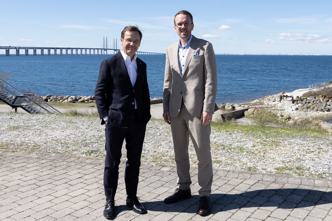 Sveriges statsminister Ulf Kristersson (M) och infrastrukturminister Andreas Carlsson (KD) presenterade de nya satsningarna på infrastruktur vid en presskonferens med utsikt mot Öresundsbron. Foto: Regeringen/Linkedin