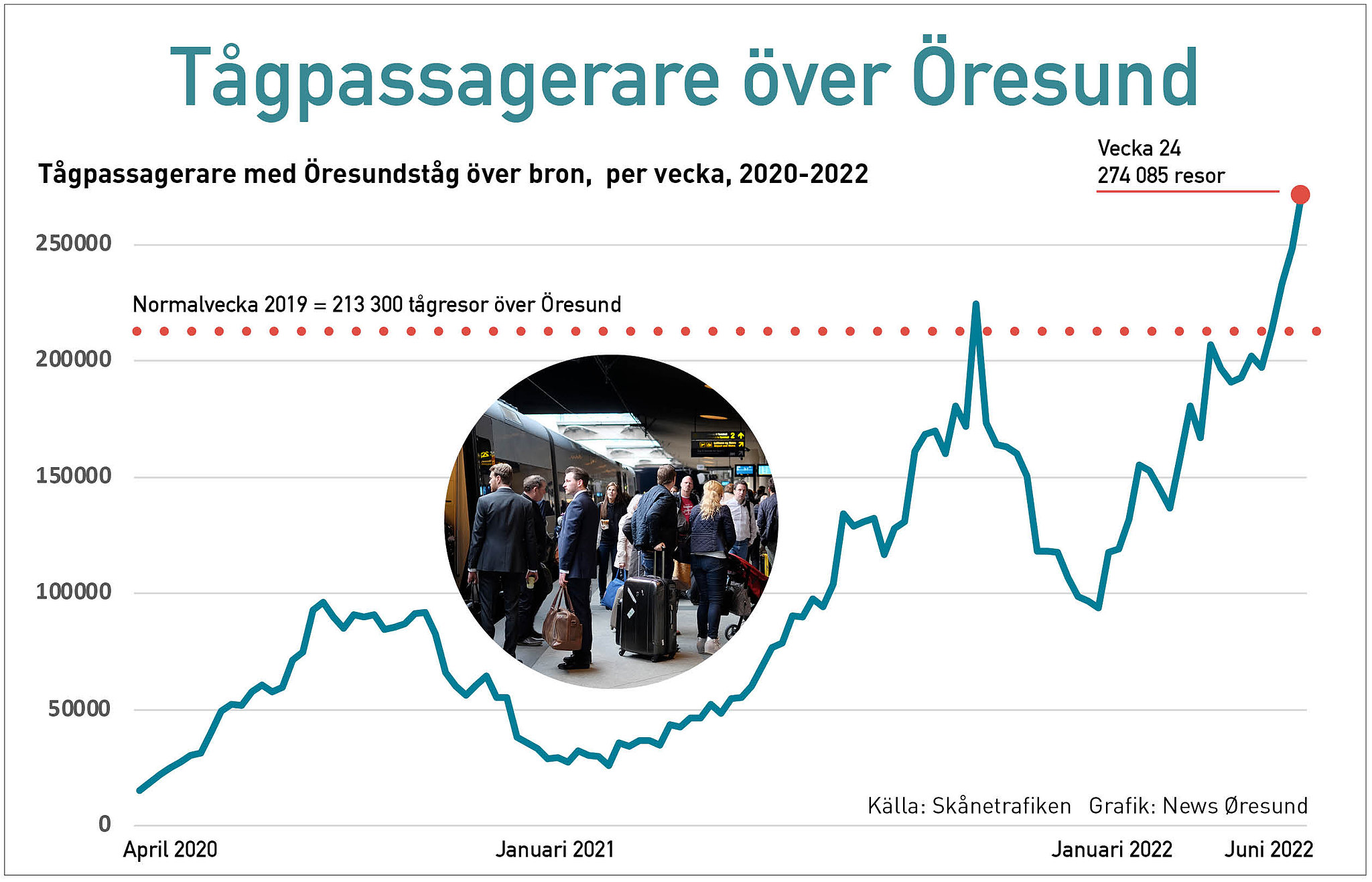 Passagerarna har återvänt till Öresundstågen med riktning mot Köpenhamn. Under vecka 24 i mitten av juni gjordes 274 085 resor med Öresundstågen mellan Danmark och Sverige. Det innebär att raset i resandet under pandemin har återhämtats och att antalet passagerare över Öresund nu ligger 28 procent över nivån från en normalvecka under 2019. Det uppger Skånetrafiken. I början av 2022 gjordes omkring 100 000 tågresor över Öresund varje vecka. I mitten av juni gjordes nästan tre gånger så många resor. (News Øresund)