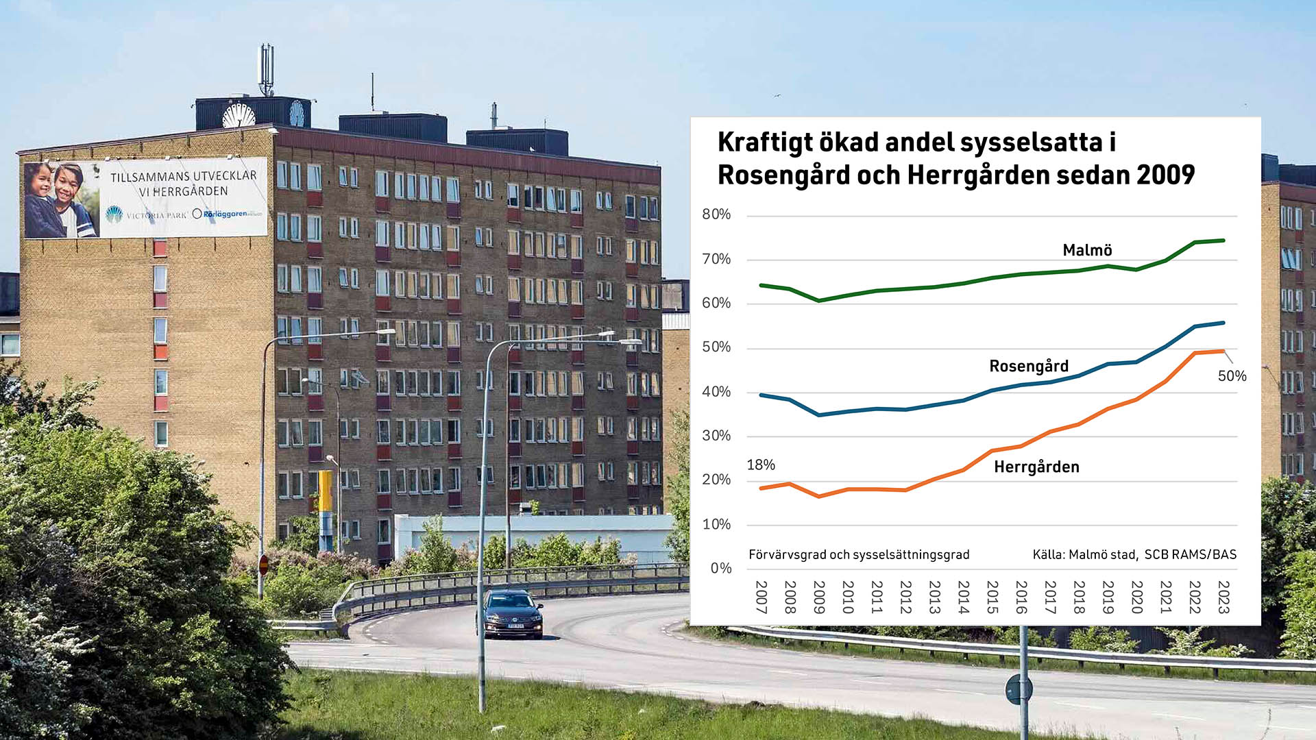 I området Herrgården i södra Rosengård i Malmö har den sociala utsattheten minskat kraftigt noterar kommunens analytiker Karl McShane i ett inlägg på Linkedin. Sedan 2009 har sysselsättningsgraden i Herrgården tredubblats och andelen hushåll med ekonomiskt bistånd har mer än halverats sedan 2016. Samtidigt har andelen unga som går ut nionde klass med behörighet till gymnasiet ökat med 24 procentenheter sedan 2012.